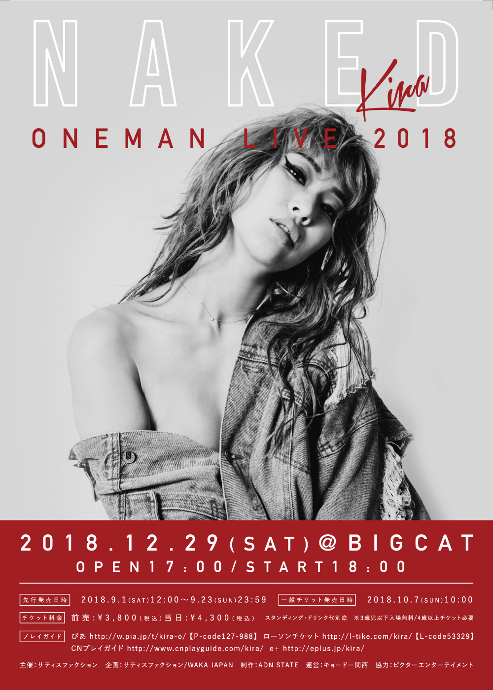“NAKED” KIRA ONEMAN LIVE 2018 9月1日(土) PM 12:00よりチケット先行販売決定!!
