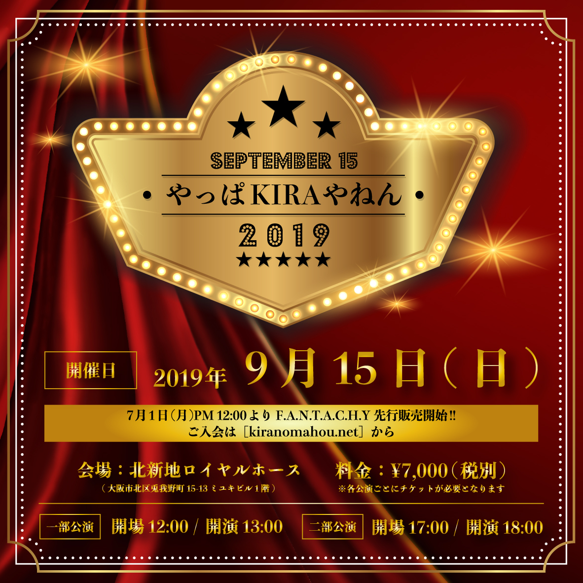 【やっぱKIRAやねん2019】KIRAオフィシャルファンクラブ〈F.A.N.T.A.C.H.Y〉にてチケット先行販売開始!!