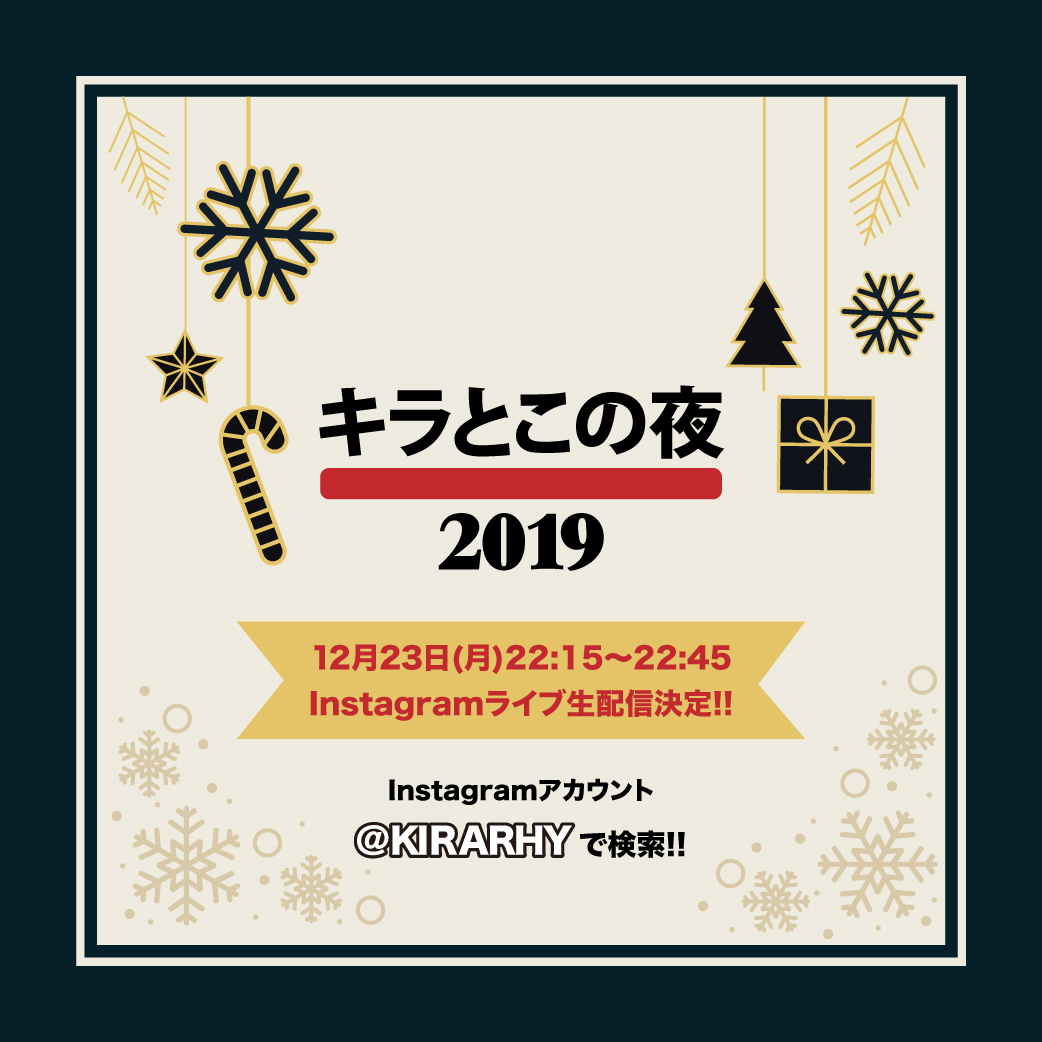 ★キラとこの夜2019★Instagramアカウントより生配信!! 2019年12月19日 ★キラとこの夜2019★Instagramアカウントより生配信!! 12月23日(月)22:15〜22:45まで KIRA Instagramアカウント[@KIRARHY]アカウントより ライブ生配信決定!! ぜひ生配信までアカウントをフォローしてお待ちください!!