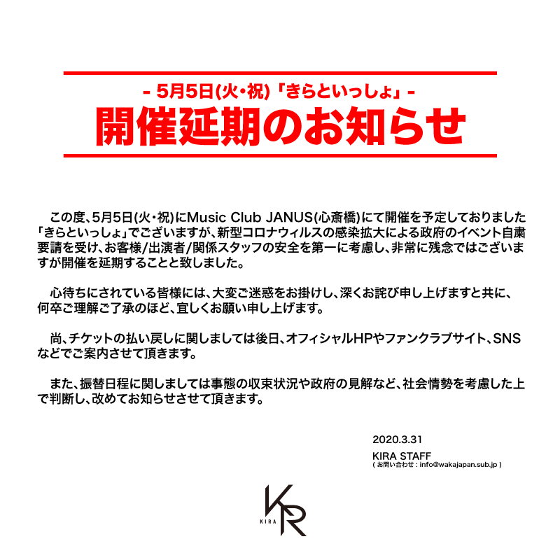 この度、5月5日(火・祝)にMusic Club JANUS(心斎橋)にて開催を予定しておりました「きらといっしょ」でございますが、