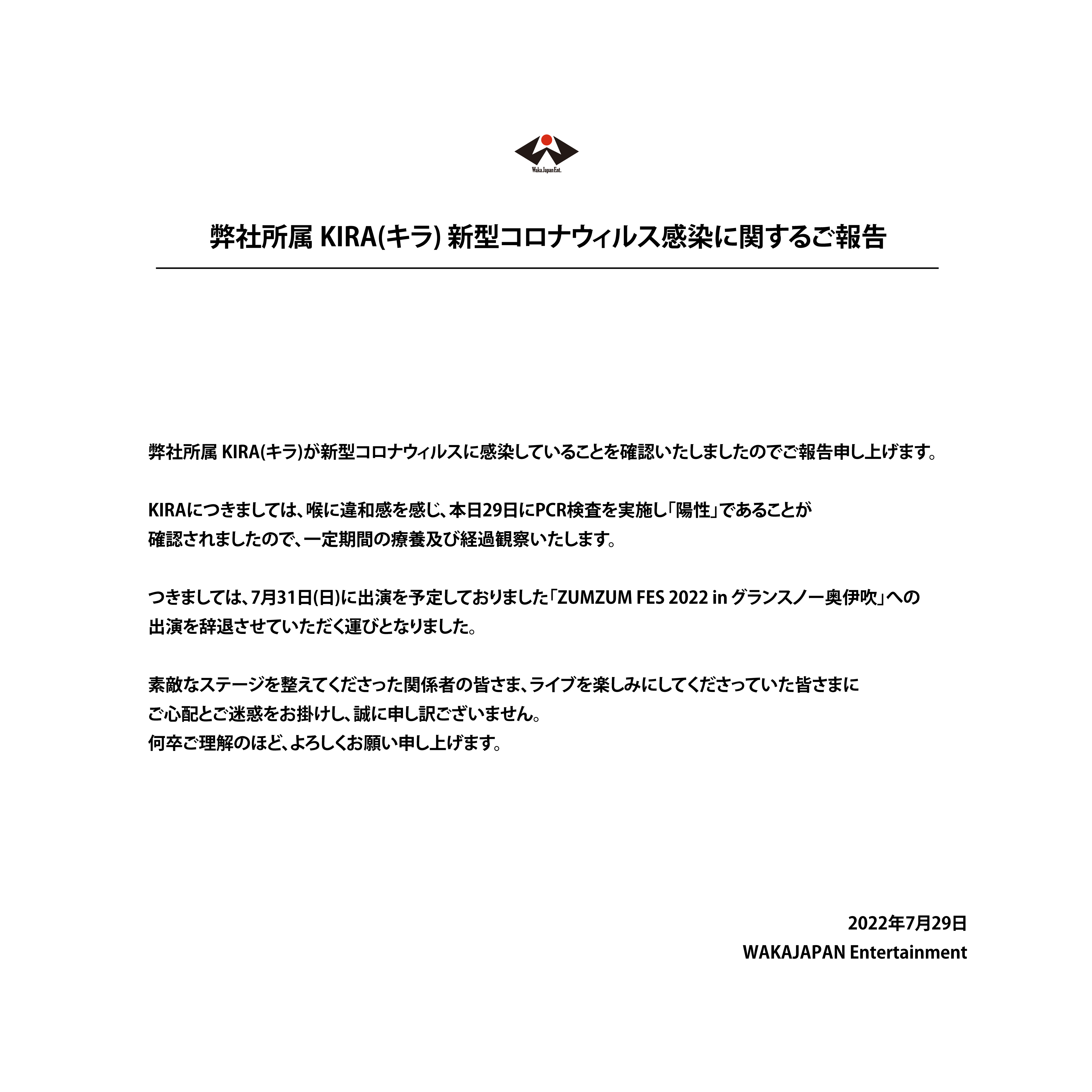 KIRAにつきましては、喉に違和感を感じ、本日29日にPCR検査を実施し「陽性」であることが